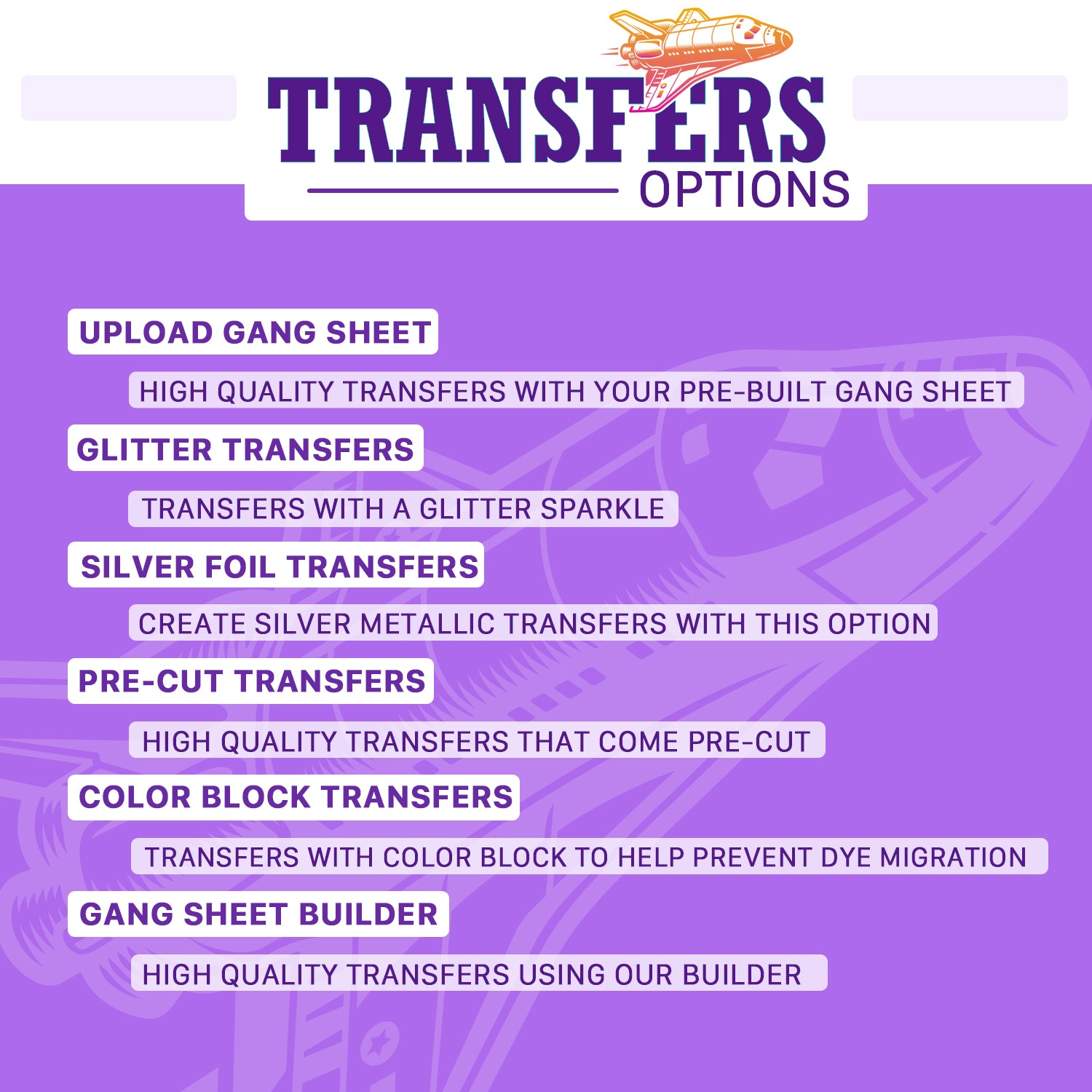 Simply upload your designs, arrange them on your gang sheet to maximize space, and we'll print your custom DTF transfers ready to press. Each transfer comes pre-cut and ready to apply to garments with a heat press.